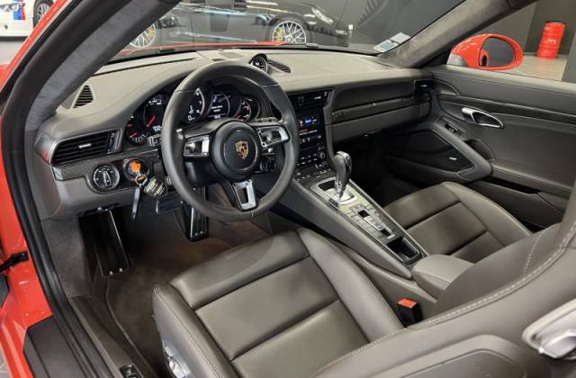 alors que l’injection est coupée, maintenant un flux d’air vers les turbocompresseurs. La transmission intégrale est toujours de mise ainsi que l'excellente boîte PDK pour propulser à 100 km/h les 540 ch du Flat-6 3.8 en à peine 3.0s. Une fusée qui en a le look avec son kit carrosserie large, légèrement redessiné, ses grandes prises d’air et son aileron mobile. Pour autant, la force et l’attrait de cette 911 résident dans sa polyvalence. Notre exemplaire dispose d'une livrée de choix avec sa rare teinte Orange fusion, les sièges sport plus et l'intérieur en cuir étendu avec inserts carbones. Un habitacle luxueux qui vous invite au voyage (très rapide). Laissez-vous séduire par cette LEGEND de l’automobile !